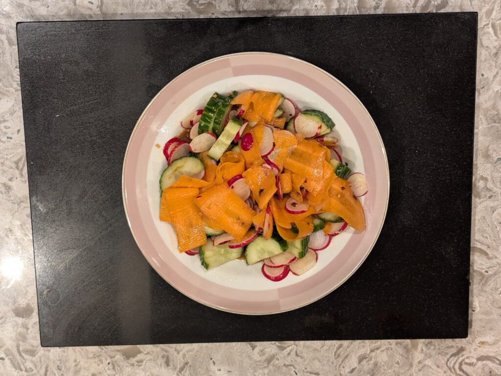 - Add half the marinade to another bowl and add the sliced mini radishes, sliced cucumber and peeled carrot ribbons to the marinade. Season with salt and mix well.